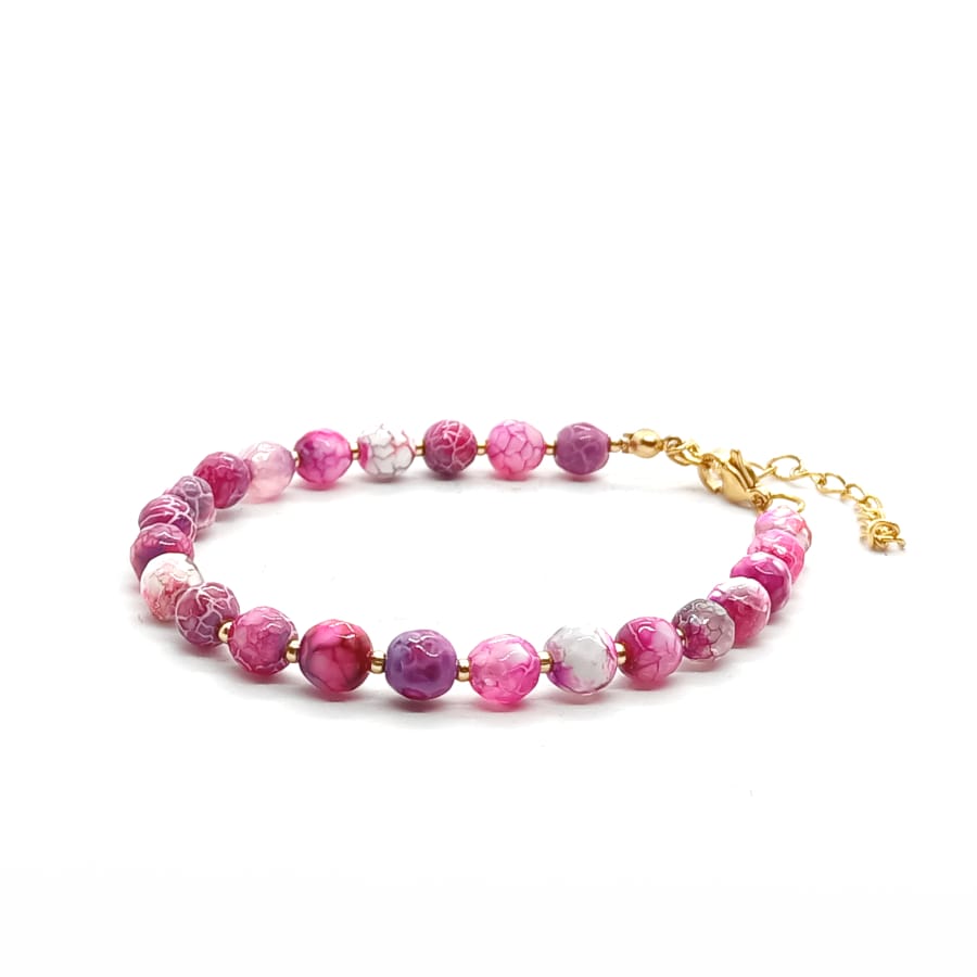 Bransoletka Agat ognisty różowy fasetowany – kamienie naturalne półszlachetne. Bransoletka z kamieni naturalnych wykonana ręcznie na lince stalowej jubilerskiej z zapięciem typu karabińczyk. Obwód wewnętrzny bransoletki: 17cm (+ łańcuszek regulacyjny o długości 4cm). Kamienie Agat ognisty różowy fasetowany o średnicy 6mm. Dodatki ze stali chirurgicznej pozłacanej. Elegancka bransoletka z kamieni naturalnych stanowi gustowną i oryginalna ozdobę nadgarstka. Bransoletka wykonana ręcznie w Polsce – Bransoletki Made in Poland.