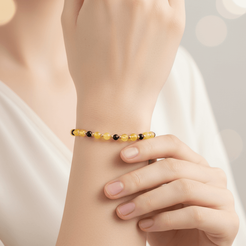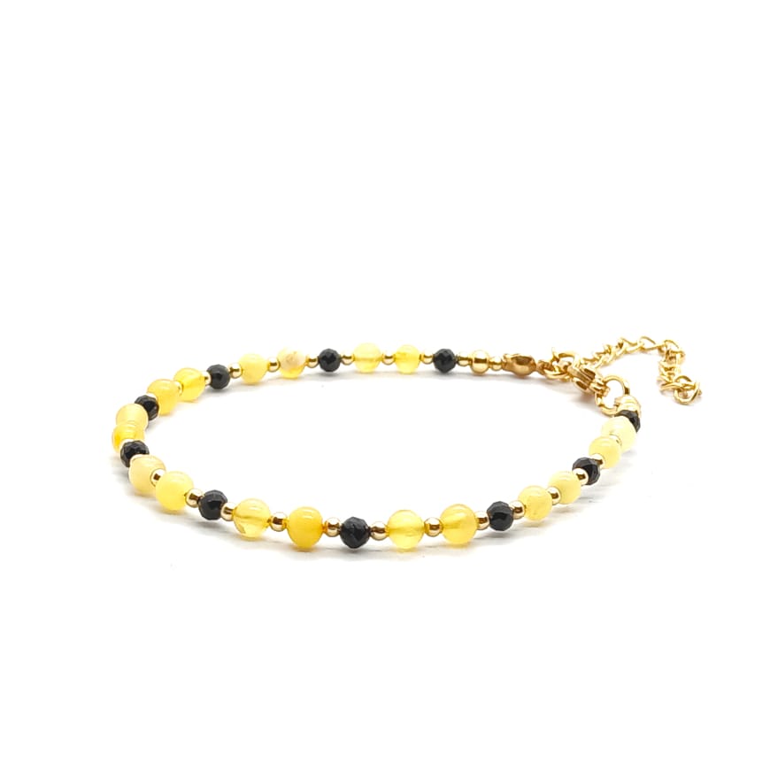 Bransoletka Bursztyn Bałtycki – minerał naturalny, żywica kopalna, Turmalin czarny – kamień naturalny. Bransoletka z minerałów naturalnych wykonana ręcznie na lince stalowej jubilerskiej z zapięciem typu karabińczyk, z dodatkową regulacją obwodu bransoletki (łańcuszek o długości 4cm). Minimalny obwód wewnętrzny bransoletki: 16cm. Bursztyn bałtycki o średnicy 4mm, Turmalin czarny fasetowany o średnicy 3mm. Dodatki ze stali chirurgicznej pozłacanej – kulki o średnicy 3mm i 2mm. Zapięcie i łańcuszek ze stali chirurgicznej pozłacanej. Elegancka bransoletka z kamieni naturalnych stanowi gustowną i oryginalna ozdobę nadgarstka. Bransoletka wykonana ręcznie w Polsce – Bransoletki Made in Poland.