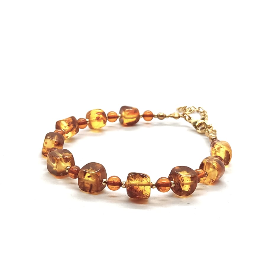 Bransoletka Bursztyn – minerał naturalny, żywica kopalna. Bransoletka z bursztynów naturalnych wykonana ręcznie na lince stalowej jubilerskiej z zapięciem typu karabińczyk z pozłacanej stali chirurgicznej, z dodatkową regulacją obwodu bransoletki (łańcuszek o długości 4cm). Minimalny obwód wewnętrzny bransoletki: 16,5cm. Bursztyn sześciany nieregularne o szerokości 6-7mm, bursztyn koniakowy o średnicy 4mm. Dodatki z hematytu w kolorze złota oraz pozłacanej stali chirurgicznej. Zapięcie i łańcuszek ze stali chirurgicznej. Elegancka bransoletka z kamieni naturalnych stanowi gustowną i oryginalna ozdobę nadgarstka. Bransoletka wykonana ręcznie w Polsce – Bransoletki Made in Poland.