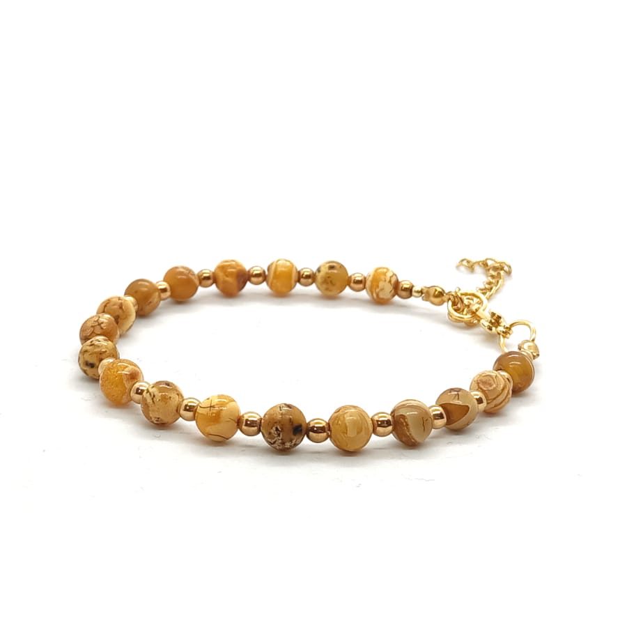 Bransoletka Bursztyn – minerał naturalny, żywica kopalna. Bransoletka z bursztynów naturalnych wykonana ręcznie na lince stalowej jubilerskiej z zapięciem typu karabińczyk z pozłacanej stali chirurgicznej, z dodatkową regulacją obwodu bransoletki (łańcuszek o długości 4cm). Minimalny obwód wewnętrzny bransoletki: 16cm. Bursztyn naturalny o średnicy 6mm. Dodatki z hematytu w kolorze złota oraz pozłacanej stali chirurgicznej. Zapięcie i łańcuszek ze stali chirurgicznej. Elegancka bransoletka z kamieni naturalnych stanowi gustowną i oryginalna ozdobę nadgarstka. Bransoletka wykonana ręcznie w Polsce – Bransoletki Made in Poland.