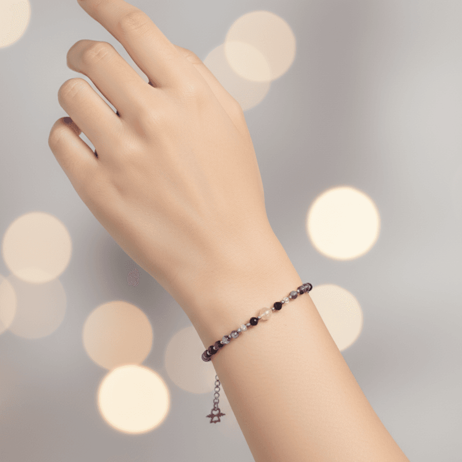 Bransoletka Cytryn, Kryształ górski, Turmalin, Masa perłowa – kamienie naturalne półszlachetne. Delikatna minimalistyczna bransoletka wykonana ręcznie, na lince stalowej jubilerskiej – obwód wewnętrzny: 18,5cm (+4cm łańcuszek regulacyjny z zawieszką w kształcie aniołka), wyposażona w karabińczyk ze stali chirurgicznej. Cytryn fasetowany o średnicy 4mm, Turmalin fasetowany o średnicy 3mm, Kryształ górski fasetowany o średnicy 3mm, Masa perłowa w kolorze fioletowym o średnicy 3mm oraz kulki ze stali chirurgicznej o średnicy 2mm. Elegancka bransoletka z kamieni naturalnych stanowi gustowną, oryginalna ozdobę nadgarstka. Bransoletka z kamieni naturalnych wykonana ręcznie w Polsce – Bransoletki Made in Poland.