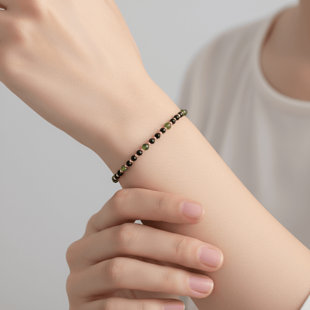 Bransoletka Czarny Turmalin, Diopsyd – kamienie naturalne półszlachetne. Minimalistyczna bransoletka z kamieni naturalnych wykonana ręcznie na lince stalowej jubilerskiej z zapięciem typu karabińczyk, z dodatkową regulacją obwodu bransoletki (łańcuszek o długości 4cm). Minimalny obwód wewnętrzny bransoletki: 16cm. Kamienie Turmalin o średnicy 3mm, Diopsyd o średnicy 3,5mm.  Dodatki z pozłacanej stali chirurgicznej. Elegancka bransoletka z kamieni naturalnych stanowi gustowną i oryginalna ozdobę nadgarstka. Bransoletka wykonana ręcznie w Polsce – Bransoletki Made in Poland.