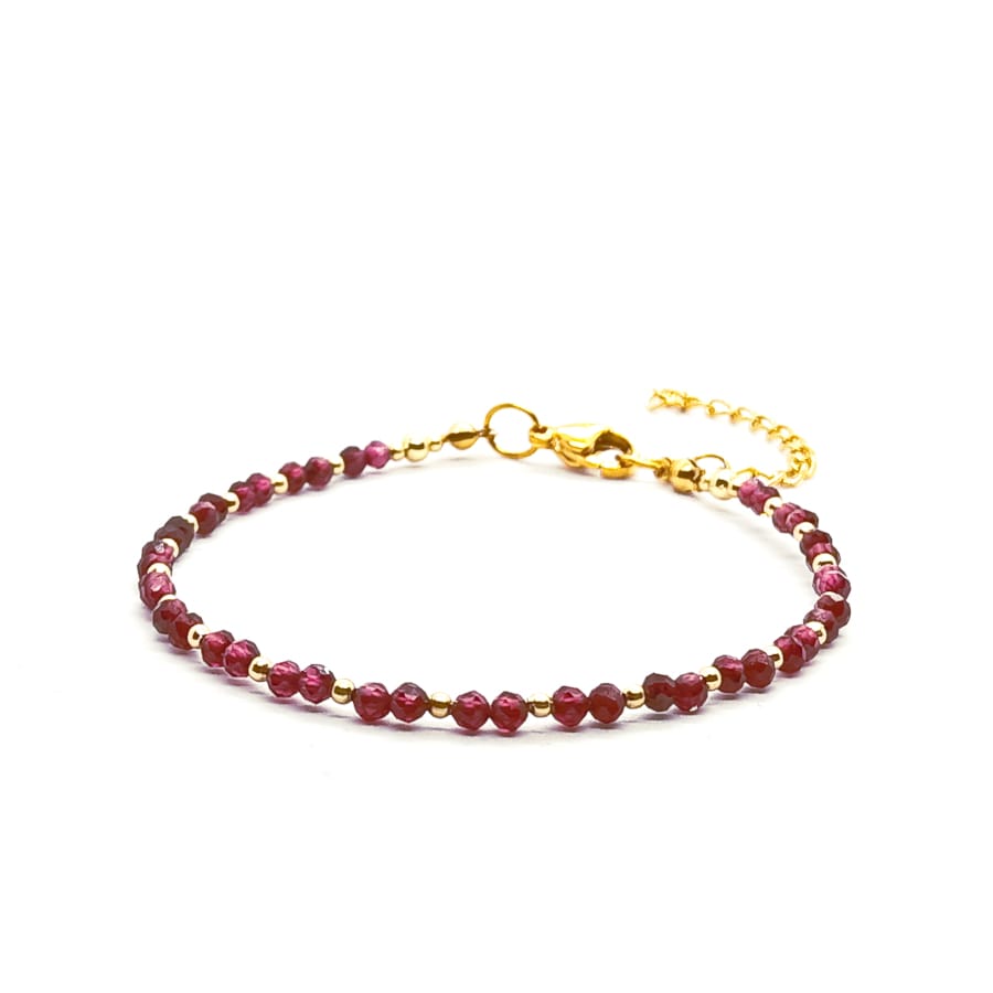 Bransoletka Granat – kamienie naturalne półszlachetne. Minimalistyczna bransoletka z kamieni naturalnych wykonana ręcznie na lince stalowej jubilerskiej z zapięciem typu karabińczyk. Rozmiar: obwód wewnętrzny wg wybranego rozmiaru + dodatkowo łańcuszek regulacyjny o długości 4cm. Kamienie Granat o średnicy 3mm. Dodatki z pozłacanej stali chirurgicznej. Elegancka bransoletka z kamieni naturalnych stanowi gustowną i oryginalna ozdobę nadgarstka. Bransoletka wykonana ręcznie w Polsce – Bransoletki Made in Poland.