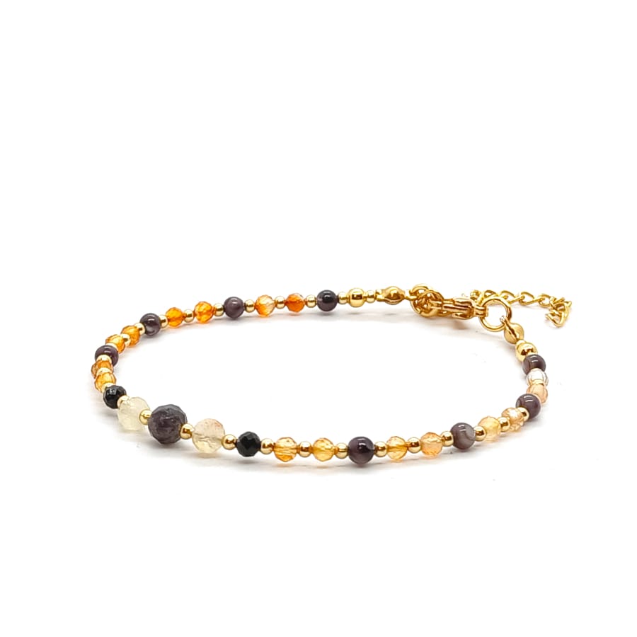 Bransoletka Karneol, Czaroit, Cytryn, Turmalin czarny, Masa perłowa – kamienie naturalne półszlachetne. Delikatna bransoletka wykonana ręcznie, na lince stalowej jubilerskiej – obwód wewnętrzny: 16cm (+4cm łańcuszek regulacyjny), wyposażona w karabińczyk z pozłacanej stali chirurgicznej. Karneol fasetowany o średnicy 3mm, Turmalin czarny fasetowany o średnicy 3mm, Masa perłowa kulki o średnicy 3mm, Cytryn fasetowany o średnicy 4mm, Czaroit fasetowany o średnicy 5mm oraz kulki z pozłacanej stali chirurgicznej o średnicy 2 i 3mm. Elegancka bransoletka z kamieni naturalnych stanowi gustowną, oryginalna ozdobę nadgarstka. Bransoletka z kamieni naturalnych wykonana ręcznie w Polsce – Bransoletki Made in Poland.