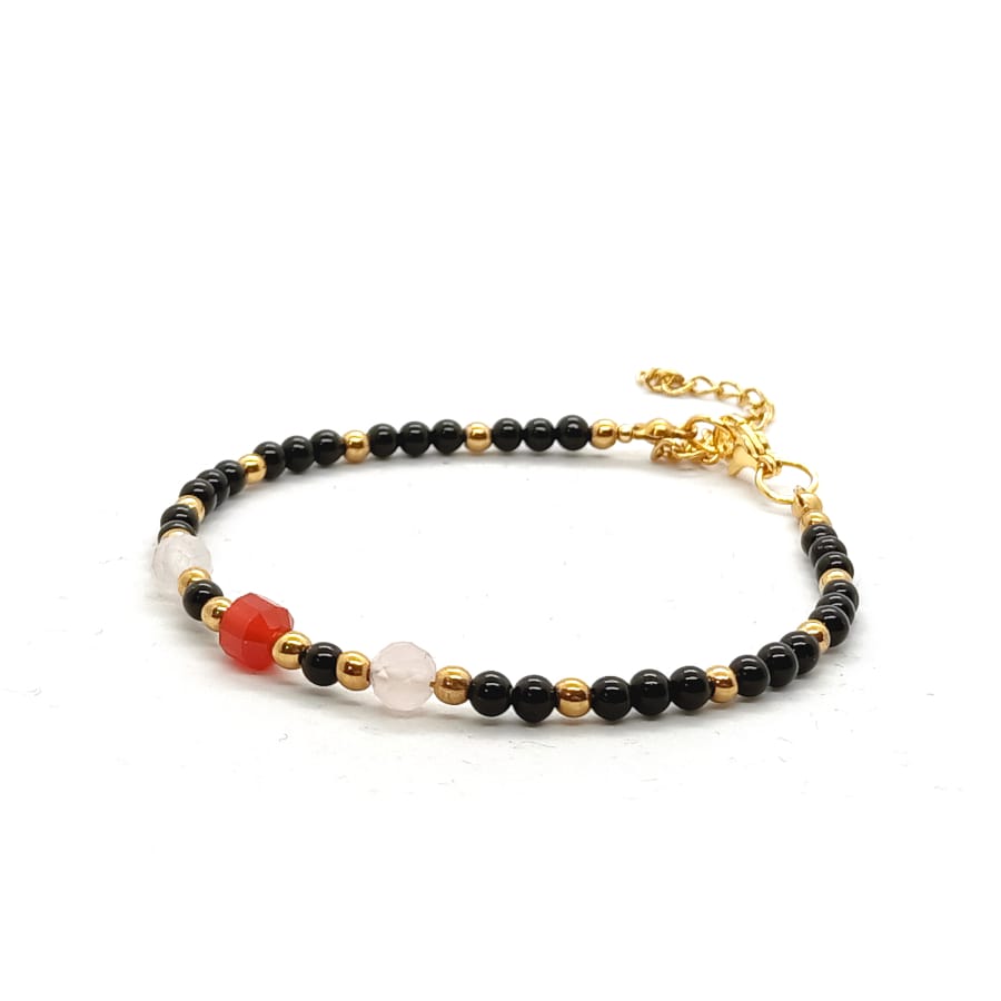 Bransoletka Karneol, Kwarc różowy, Onyks – kamienie naturalne półszlachetne. Bransoletka z kamieni naturalnych wykonana ręcznie na lince stalowej jubilerskiej z zapięciem typu karabińczyk, z dodatkową regulacją obwodu bransoletki (łańcuszek o długości 4cm). Minimalny obwód wewnętrzny bransoletki: 17,5cm. Kamienie Karneol baryłka w rozmiarze 5x8mm, Kwarc różowy fasetowany o średnicy 6mm, Onyks o średnicy 3mm, hematyt kulki złote o średnicy 3mm. Dodatki ze stali chirurgicznej pozłacanej. Elegancka bransoletka z kamieni naturalnych stanowi gustowną i oryginalna ozdobę nadgarstka. Bransoletka wykonana ręcznie w Polsce – Bransoletki Made in Poland.