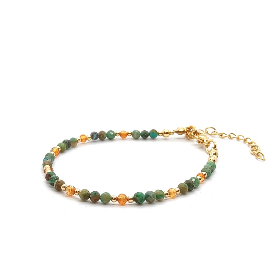 Bransoletka Karneol, Turkus afrykański – kamienie naturalne półszlachetne. Delikatna bransoletka wykonana ręcznie, na lince stalowej jubilerskiej – obwód wewnętrzny: 15,5cm (+4cm łańcuszek regulacyjny), wyposażona w karabińczyk z pozłacanej stali chirurgicznej. Karneol fasetowany o średnicy 3mm, Turkus afrykański fasetowany o średnicy 3mm oraz kulki z pozłacanej stali chirurgicznej o średnicy 2 i 3mm. Elegancka bransoletka z kamieni naturalnych stanowi gustowną, oryginalna ozdobę nadgarstka. Bransoletka z kamieni naturalnych wykonana ręcznie w Polsce – Bransoletki Made in Poland.