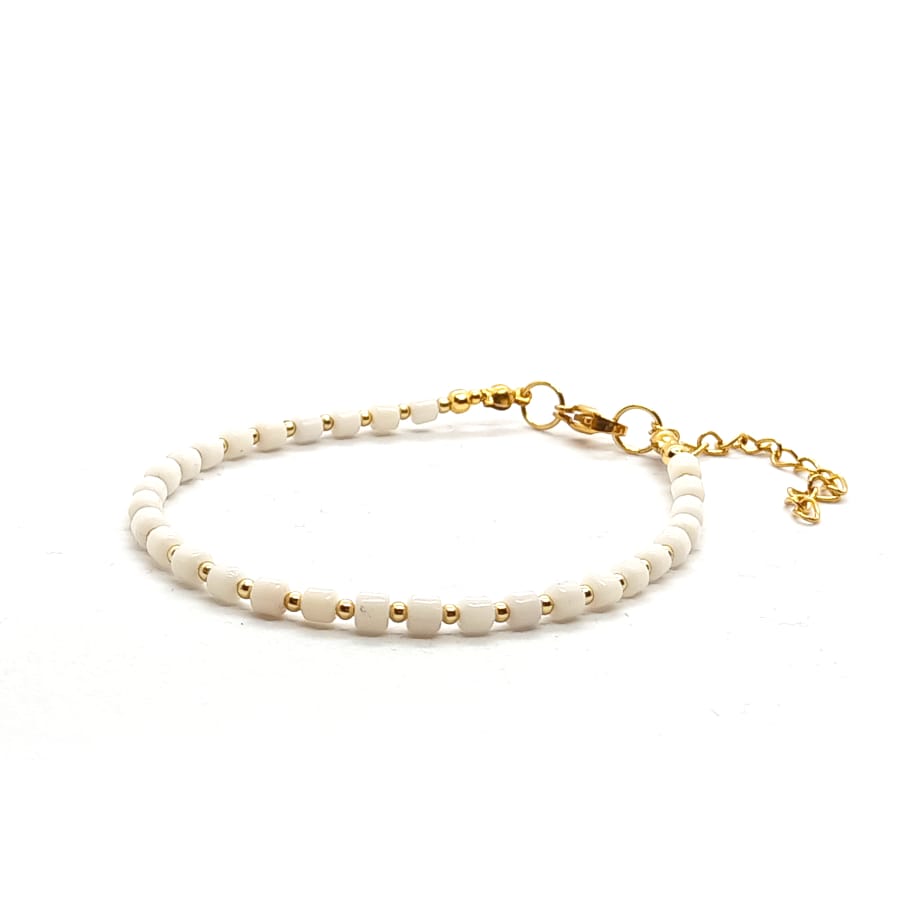 Bransoletka Koral biały – minerały naturalne. Bransoletka wykonana ręcznie, na lince stalowej jubilerskiej – obwód wewnętrzny: 17cm (+4cm łańcuszek regulacyjny), wyposażona w karabińczyk z pozłacanej stali chirurgicznej. Koral biały wałki o średnicy 3mm oraz stal chirurgiczna o średnicy 2 i 3mm. Elegancka bransoletka z kamieni naturalnych stanowi gustowną, oryginalna ozdobę nadgarstka. Bransoletka z kamieni naturalnych wykonana ręcznie w Polsce – Bransoletki Made in Poland.