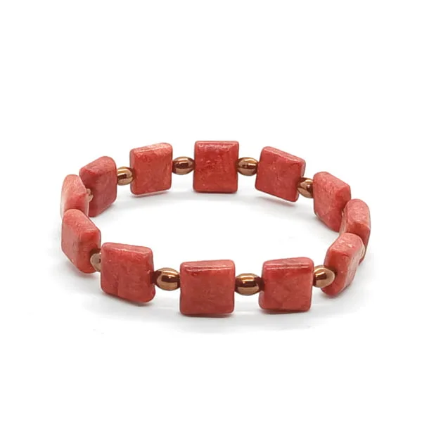 Bransoletka z czerwonego korala oraz hematytu w kolorze miedzianym – kamienie naturalne. Bransoletka z kamieni naturalnych wykonana ręcznie na elastycznej żyłce jubilerskiej – obwód wewnętrzny: 17cm. Czerwony koral o boku 10mm, hematyt o średnicy 4mm. Elegancka bransoletka z kamieni naturalnych stanowi gustowną, oryginalna ozdobę nadgarstka. Bransoletka z kamieni naturalnych wykonana ręcznie w Polsce – Bransoletki Made in Poland.