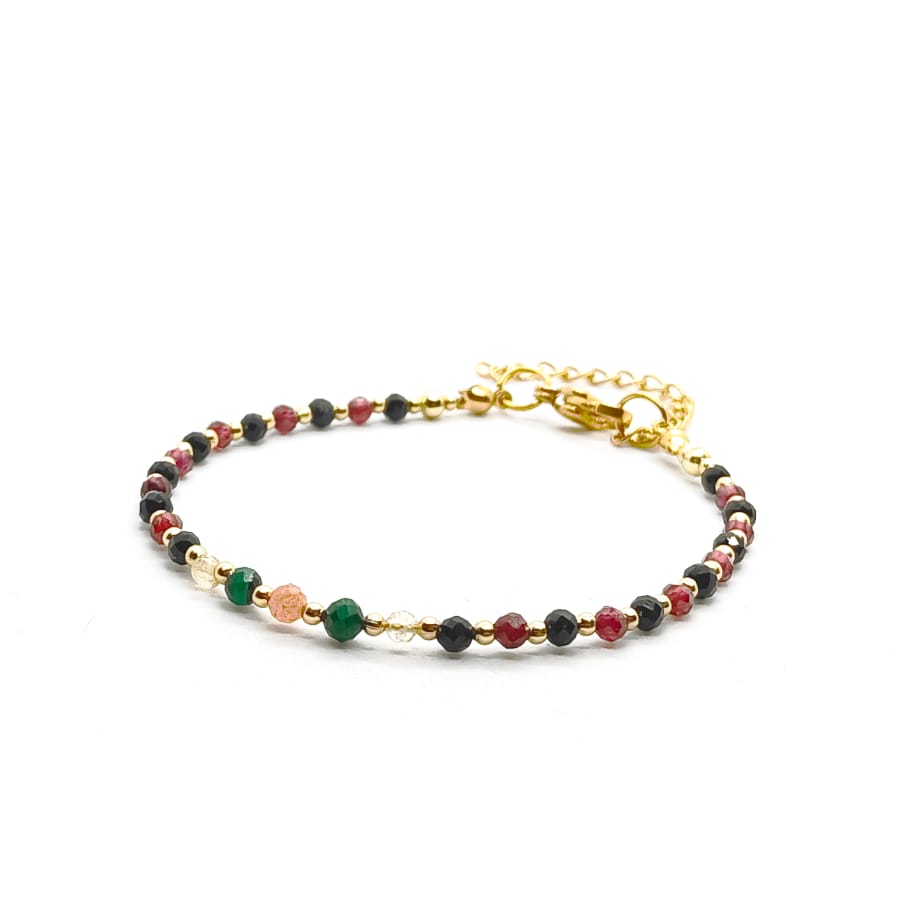 Bransoletka Malachit, Kamień słoneczny, Granat, Cytryn, Turmalin – kamienie naturalne półszlachetne. Minimalistyczna bransoletka wykonana ręcznie, na lince stalowej jubilerskiej – obwód wewnętrzny: 16,5cm (+4cm łańcuszek regulacyjny), wyposażona w karabińczyk ze stali chirurgicznej pozłacanej. Kamienie naturalne: Malachit, Kamień słoneczny, Granat, Cytryn, Turmalin o średnicy 3mm oraz kulki ze stali chirurgicznej o średnicy 2mm. Elegancka bransoletka z kamieni naturalnych stanowi gustowną, oryginalna ozdobę nadgarstka. Bransoletka z kamieni naturalnych wykonana ręcznie w Polsce – Bransoletki Made in Poland.