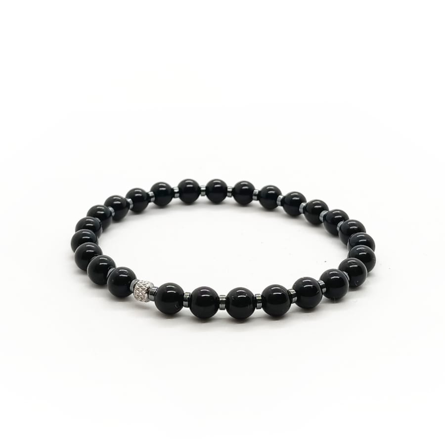 Bransoletka męska Onyks – kamienie naturalne półszlachetne. Bransoletka z kamieni naturalnych wykonana ręcznie na elastycznej żyłce jubilerskiej – obwód wewnętrzny: 17cm. Onyks kulki o średnicy 6mm. Dodatki z hematytu w kolorze grafitowym i grafitowym oraz ze stali chirurgicznej w kolorze srebra. Elegancka bransoletka z kamieni naturalnych stanowi gustowną i oryginalna ozdobę nadgarstka. Bransoletka wykonana ręcznie w Polsce – Bransoletki Made in Poland.