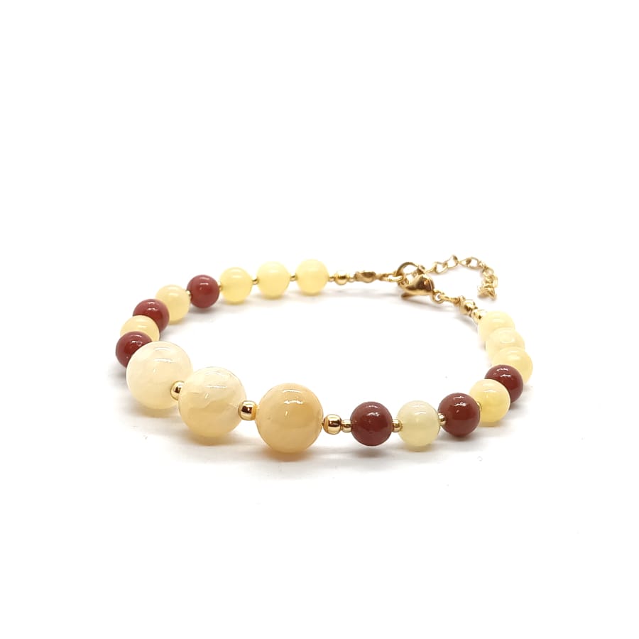 Bransoletka Nefryt bursztynowy, Jaspis czerwony – kamienie naturalne. Bransoletka wykonana ręcznie, na lince stalowej jubilerskiej – obwód wewnętrzny: 17,5cm (+4cm łańcuszek regulacyjny), wyposażona w karabińczyk z pozłacanej stali chirurgicznej. Kamienie Nefryt bursztynowy o średnicy 6 i 10 mm, Jaspis czerwony o średnicy 6mm oraz stal chirurgiczna pozłacana o średnicy 2 i 3mm. Elegancka bransoletka z kamieni naturalnych stanowi gustowną, oryginalna ozdobę nadgarstka. Bransoletka z kamieni naturalnych wykonana ręcznie w Polsce – Bransoletki Made in Poland.