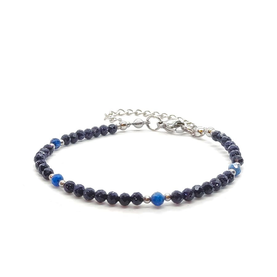Bransoletka Noc Kairu, Lapis lazuli – kamienie półszlachetne. Bransoletka wykonana ręcznie, na lince stalowej jubilerskiej – obwód wewnętrzny: 15cm (+4cm łańcuszek regulacyjny), wyposażona w karabińczyk ze stali chirurgicznej. Kamienie Noc Kairu fasetowany o średnicy 3mm, Lapis lazuli fasetowany o średnicy 3mm oraz stal chirurgiczna o średnicy 2 i 3mm. Elegancka bransoletka z kamieni naturalnych stanowi gustowną, oryginalna ozdobę nadgarstka. Bransoletka z kamieni naturalnych wykonana ręcznie w Polsce – Bransoletki Made in Poland.
