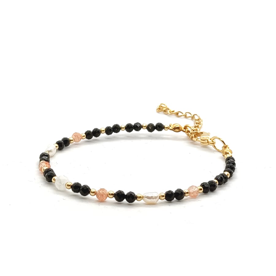 Bransoletka Perła naturalna, Kamień księżycowy, Kamień słoneczny, Turmalin – kamienie naturalne półszlachetne. Bransoletka wykonana ręcznie na lince stalowej jubilerskiej z zapięciem typu karabińczyk, z dodatkową regulacją obwodu bransoletki (łańcuszek o długości 4cm). Minimalny obwód wewnętrzny bransoletki: 16cm. Kamienie: Turmalin czarny fasetowany, Kamień słoneczny fasetowany – o średnicy 3mm, Kamień księżycowy o średnicy 4mm, Perły naturalne białe w rozmiarze 6x4mm oraz kulki z pozłacanej stali chirurgicznej o średnicy 2mm. Elegancka bransoletka z kamieni naturalnych stanowi gustowną, oryginalna ozdobę nadgarstka. Bransoletka z kamieni naturalnych wykonana ręcznie w Polsce – Bransoletki Made in Poland.