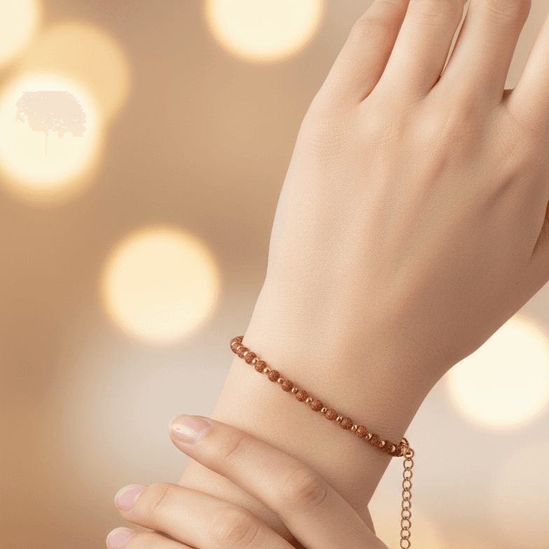 Bransoletka Piasek Pustyni – bransoletka z kamieni o charakterystycznie mieniącej się brązowej barwie. Bransoletka wykonana ręcznie na lince stalowej jubilerskiej z zapięciem typu karabińczyk, z dodatkową regulacją obwodu bransoletki (łańcuszek o długości 4cm). Minimalny obwód wewnętrzny bransoletki: 17cm. Kamienie Piasek Pustyni o średnicy 3mm, hematyt kulki złote o średnicy 2mm. Dodatki z pozłacanej stali chirurgicznej. Elegancka bransoletka z kamieni naturalnych stanowi gustowną i oryginalna ozdobę nadgarstka. Bransoletka wykonana ręcznie w Polsce – Bransoletki Made in Poland. Zobacz też inne dostępne rozmiary.