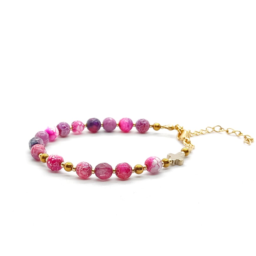 Bransoletka różaniec (dziesiątka różańca) – Agat ognisty różowy fasetowany. Różaniec typu bransoletka wykonany ręcznie, na lince stalowej jubilerskiej – obwód wewnętrzny: 15cm (+4cm łańcuszek regulacyjny), wyposażony w karabińczyk z pozłacanej stali chirurgicznej. Agat ognisty różowy o średnicy 6mm. Kulki ze stali chirurgicznej o średnicy 2mm, kulki z hematytu o średnicy 3mm. Krzyżyk wykonany z hematytu w kolorze złotym o wymiarach 6x8mm. Różaniec na nadgarstek zarówno elegancko prezentuje się, jak i jest subtelnym wyznaniem wiary. Bransoletka różaniec wykonana ręcznie w Polsce – Bransoletki Made in Poland.