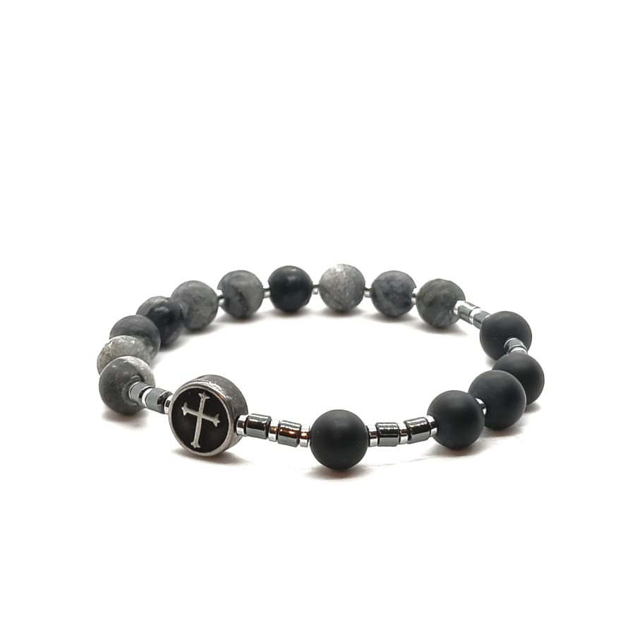 Bransoletka różaniec (dziesiątka różańca) – Jaspis szary i Lawa wulkaniczna prasowana. Różaniec typu bransoletka wykonany ręcznie, na elastycznej żyłce jubilerskiej – obwód wewnętrzny: 16,5cm. Kamienie naturalne o średnicy 8mm, monetka ze stali chirurgicznej z symbolem krzyża o średnicy 10mm, hematyt o średnicy 3mm. Różaniec na nadgarstek zarówno elegancko prezentuje się, jak i jest subtelnym wyznaniem wiary. Bransoletka różaniec wykonana ręcznie w Polsce – Bransoletki Made in Poland.