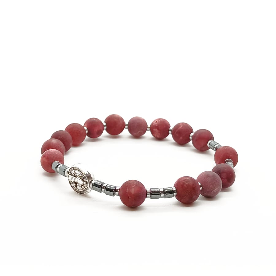 Bransoletka różaniec (dziesiątka) z Krzyżem św. Benedykta. Bransoletka różaniec wykonana ręcznie z kamienie naturalnych półszlachetnych. Agat bordowy matowy i Hematyt. Bransoletka na elastycznej żyłce jubilerskiej – obwód wewnętrzny: 17cm. Kamienie o średnicy 8mm i 3mm. Medalik z krzyżem św. Benedykta o średnicy 10mm – masywny stop cynku w kolorze srebra, błyszczący, z wyraźnymi szczegółami. Bransoletka różaniec wykonana ręcznie w Polsce – Bransoletki Made in Poland.
