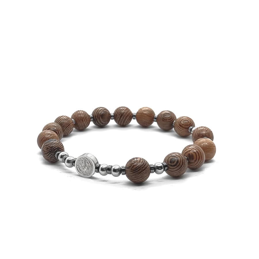 Bransoletka różaniec (dziesiątka) – koraliki z drewna orzechowego. Obwód wewnętrzny bransoletki wynosi 16cm. Bransoletka z drewna wykonana ręcznie, na elastycznej żyłce jubilerskiej. Koraliki z drewna orzechowego o średnicy 8mm, kulki ze stali chirurgicznej o średnicy 4mm, hematyt grafitowy o średnicy 3mm. Medalik z krzyżem św. Benedykta o średnicy 8mm ze stali chirurgicznej, z wyraźnymi szczegółami. Dodatki ze stali chirurgicznej i hematytu. Bransoletka różaniec wykonana ręcznie w Polsce – Bransoletki Made in Poland.