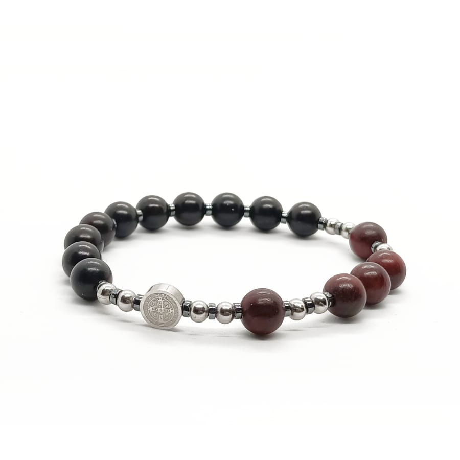 Bransoletka różaniec (dziesiątka) – koraliki z drewna sandałowego w kolorze czarnym i mahoniowym. Obwód wewnętrzny bransoletki wynosi 16,5cm. Bransoletka z drewna wykonana ręcznie, na elastycznej żyłce jubilerskiej. Koraliki z drewna sandałowego o średnicy 8mm, kulki ze stali chirurgicznej o średnicy 4mm, hematyt grafitowy o średnicy 3mm. Medalik z krzyżem św. Benedykta o średnicy 8mm ze stali chirurgicznej, z wyraźnymi szczegółami. Dodatki ze stali chirurgicznej i hematytu. Bransoletka różaniec wykonana ręcznie w Polsce – Bransoletki Made in Poland.