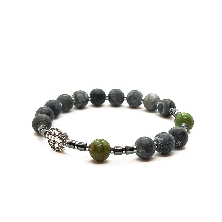 Bransoletka różaniec (dziesiątka) z Krzyżem św. Benedykta. Bransoletka różaniec wykonana ręcznie z kamieni: Jaspis szary, jaspis morski i Hematyt. Bransoletka na elastycznej żyłce jubilerskiej – obwód wewnętrzny: 16,5cm. Kamienie o średnicy 8mm i 3mm. Medalik z krzyżem św. Benedykta o średnicy 10mm – masywny stop cynku w kolorze srebra, błyszczący, z wyraźnymi szczegółami. Bransoletka różaniec wykonana ręcznie w Polsce – Bransoletki Made in Poland.