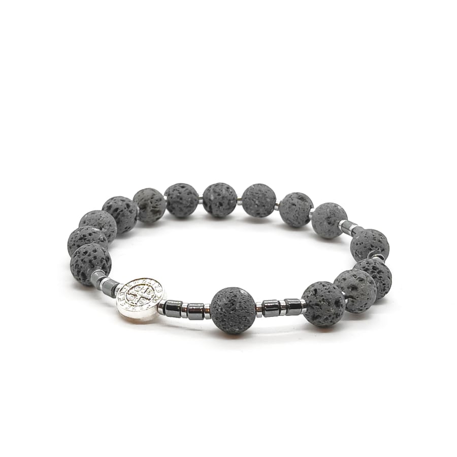 Bransoletka różaniec (dziesiątka) z Krzyżem św. Benedykta. Bransoletka różaniec wykonana ręcznie z kamienie naturalnych półszlachetnych. Lawa wulkaniczna szara i Hematyt. Bransoletka na elastycznej żyłce jubilerskiej – obwód wewnętrzny: 17,5cm. Kamienie o średnicy 8mm i 3mm. Medalik z krzyżem św. Benedykta o średnicy 10mm – masywny stop cynku w kolorze srebra, błyszczący, z wyraźnymi szczegółami. Bransoletka różaniec wykonana ręcznie w Polsce – Bransoletki Made in Poland.