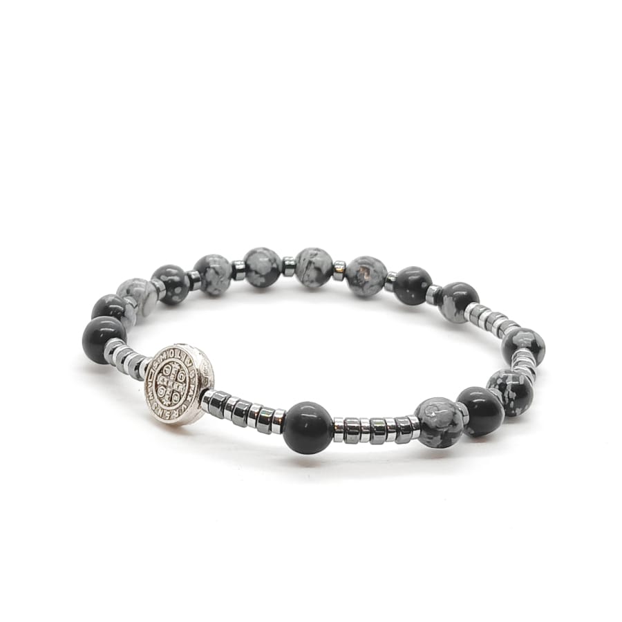 Bransoletka różaniec (dziesiątka) z Krzyżem św. Benedykta. Bransoletka różaniec wykonana ręcznie z kamieni: Obsydian śnieżny i Hematyt. Bransoletka na elastycznej żyłce jubilerskiej – obwód wewnętrzny: 15cm. Kamienie Obsydian śnieżny o średnicy 6mm, hematyt w kolorze grafitowym i srebrnym o średnicy 3mm. Medalik z krzyżem św. Benedykta o średnicy 10mm – masywny stop cynku w kolorze srebra, błyszczący, z wyraźnymi szczegółami. Bransoletka różaniec wykonana ręcznie w Polsce – Bransoletki Made in Poland.