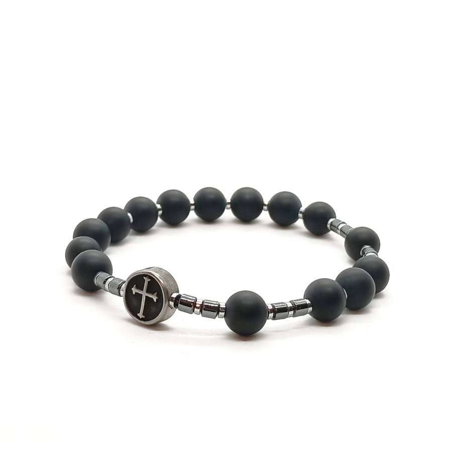Bransoletka różaniec (dziesiątka różańca) – Lawa wulkaniczna prasowana. Różaniec typu bransoletka wykonany ręcznie, na elastycznej żyłce jubilerskiej – obwód wewnętrzny: 17cm. Kamienie naturalne o średnicy 8mm, monetka ze stali chirurgicznej z symbolem krzyża o średnicy 10mm, hematyt o średnicy 3mm. Różaniec na nadgarstek zarówno elegancko prezentuje się, jak i jest subtelnym wyznaniem wiary. Bransoletka różaniec wykonana ręcznie w Polsce – Bransoletki Made in Poland.