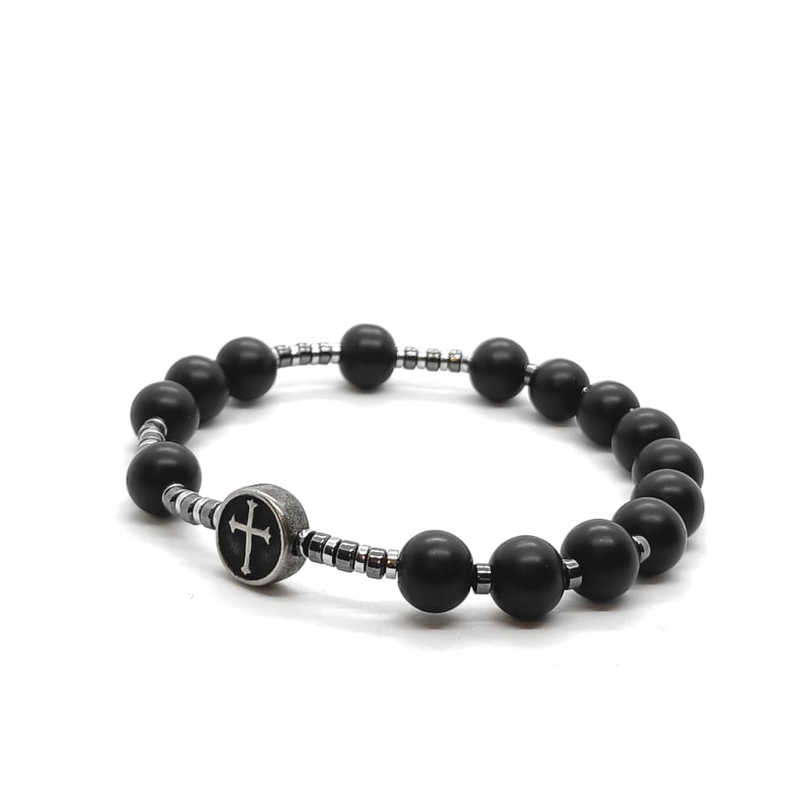 Bransoletka różaniec (dziesiątka różańca) – Onyks. Różaniec typu bransoletka wykonany ręcznie, na elastycznej żyłce jubilerskiej – obwód wewnętrzny: 17cm. Onyks matowy o średnicy 8mm, monetka ze stali chirurgicznej z symbolem krzyża o średnicy 10mm, hematyt w kolorze srebrnym i grafitowym o średnicy 3mm. Różaniec na nadgarstek zarówno elegancko prezentuje się, jak i jest subtelnym wyznaniem wiary. Bransoletka różaniec wykonana ręcznie w Polsce – Bransoletki Made in Poland.