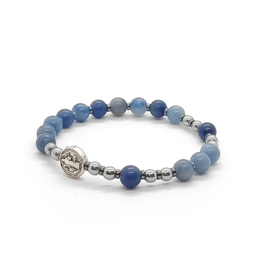 Bransoletka różaniec (dziesiątka) z Krzyżem św. Benedykta. Bransoletka różaniec wykonana ręcznie z kamienie naturalnych półszlachetnych Awenturyn i Hematyt. Bransoletka na elastycznej żyłce jubilerskiej – obwód wewnętrzny: 15,5cm. Kamienie o średnicy 7mm, 4mm i 3mm. Medalik z krzyżem św. Benedykta o średnicy 10mm – masywny stop cynku w kolorze srebra, błyszczący, z wyraźnymi szczegółami. Bransoletka różaniec wykonana ręcznie w Polsce – Bransoletki Made in Poland.