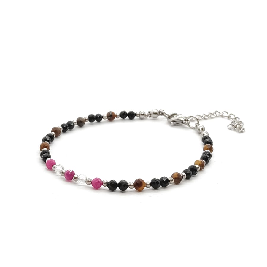 Bransoletka Topaz, Rubin, Turmalin, Tygrysie oko – kamienie naturalne. Minimalistyczna bransoletka wykonana ręcznie, na lince stalowej jubilerskiej – obwód wewnętrzny: 16cm (+4cm łańcuszek regulacyjny), wyposażona w karabińczyk ze stali chirurgicznej. Topaz fasetowany o średnicy 3mm, Rubin fasetowany o średnicy 3mm, Turmalin czarny fasetowany o średnicy 3mm, Tygrysie oko fasetowane o średnicy 3mm oraz kulki ze stali chirurgicznej o średnicy 2 i 3mm. Elegancka bransoletka z kamieni naturalnych stanowi gustowną, oryginalna ozdobę nadgarstka. Bransoletka z kamieni naturalnych wykonana ręcznie w Polsce – Bransoletki Made in Poland.
