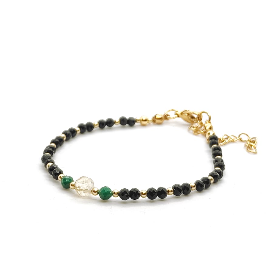 Bransoletka Turmalin czarny, Cytryn, Malachit – kamienie naturalne półszlachetne. Delikatna bransoletka wykonana ręcznie, na lince stalowej jubilerskiej – obwód wewnętrzny: 15,5cm (+4cm łańcuszek regulacyjny), wyposażona w karabińczyk z pozłacanej stali chirurgicznej. Turmalin czarny fasetowany o średnicy 3mm, Malachit fasetowany o średnicy 3mm, Cytryn fasetowany o średnicy 5mm oraz kulki z pozłacanej stali chirurgicznej o średnicy 2 i 3mm. Elegancka bransoletka z kamieni naturalnych stanowi gustowną, oryginalna ozdobę nadgarstka. Bransoletka z kamieni naturalnych wykonana ręcznie w Polsce – Bransoletki Made in Poland.