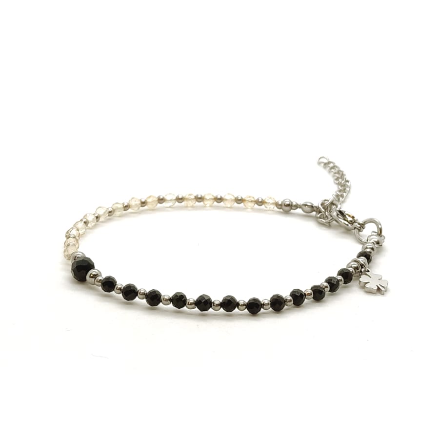 Bransoletka z koniczynką, Cytryn, Turmalin – kamienie naturalne półszlachetne. Delikatna minimalistyczna bransoletka wykonana ręcznie, na lince stalowej jubilerskiej – obwód wewnętrzny: 16,5cm (+4cm łańcuszek regulacyjny), wyposażona w karabińczyk ze stali chirurgicznej. Cytryn fasetowany o średnicy 3mm, Turmalin fasetowany o średnicy 5 i 3mm oraz kulki ze stali chirurgicznej o średnicy 2mm. Elegancka bransoletka z kamieni naturalnych stanowi gustowną, oryginalna ozdobę nadgarstka. Bransoletka z kamieni naturalnych wykonana ręcznie w Polsce – Bransoletki Made in Poland.