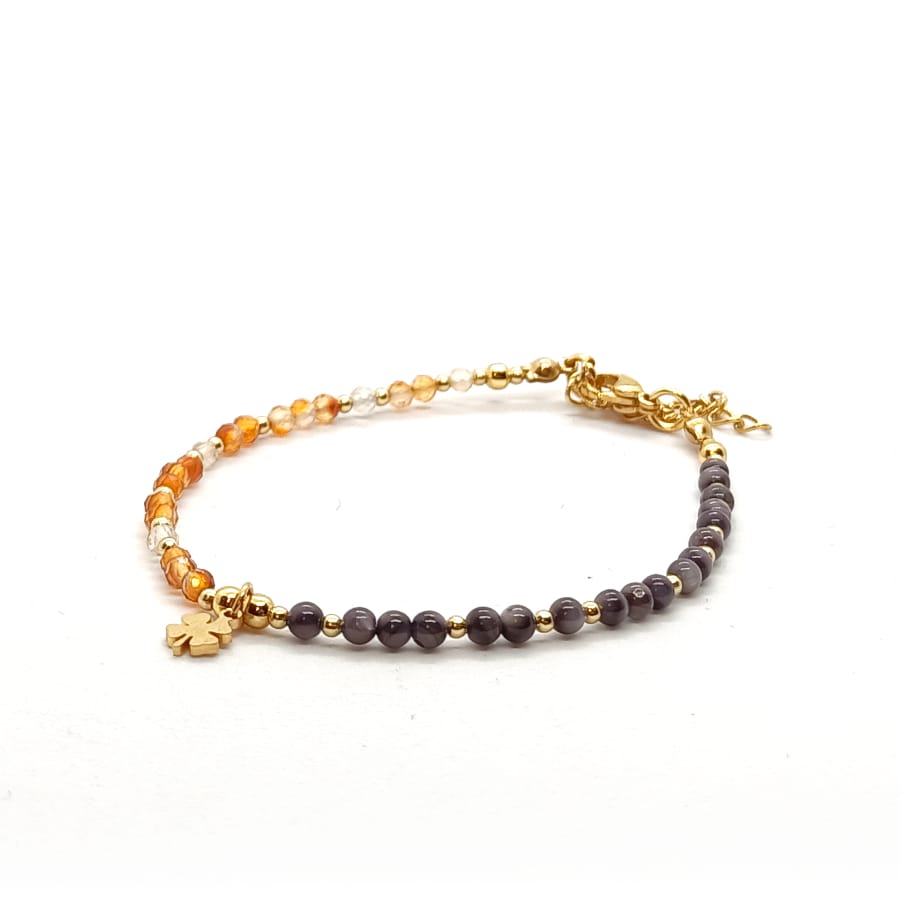 Bransoletka z koniczynką Karneol, Masa perłowa – kamienie naturalne półszlachetne. Delikatna bransoletka wykonana ręcznie, na lince stalowej jubilerskiej – obwód wewnętrzny: 16cm (+4cm łańcuszek regulacyjny), wyposażona w karabińczyk z pozłacanej stali chirurgicznej. Karneol fasetowany o średnicy 3mm, Masa perłowa o średnicy 3mm oraz kulki z pozłacanej stali chirurgicznej o średnicy 2 i 3mm. Elegancka bransoletka z kamieni naturalnych stanowi gustowną, oryginalna ozdobę nadgarstka. Bransoletka z kamieni naturalnych wykonana ręcznie w Polsce – Bransoletki Made in Poland.